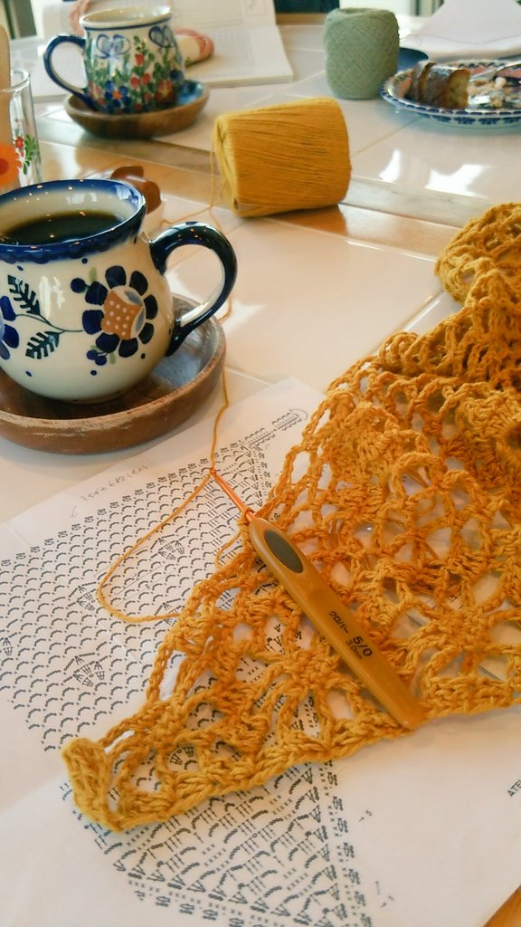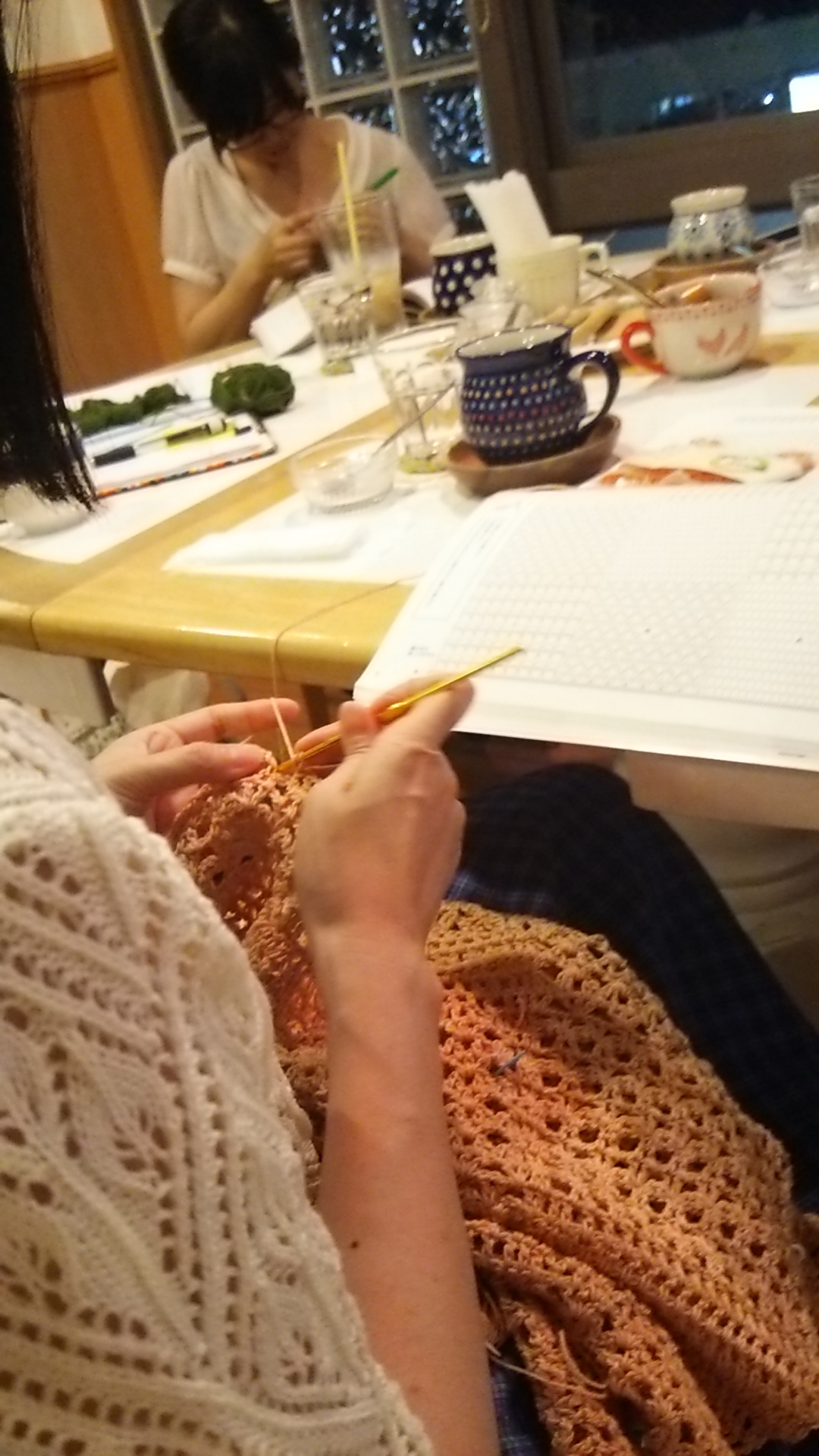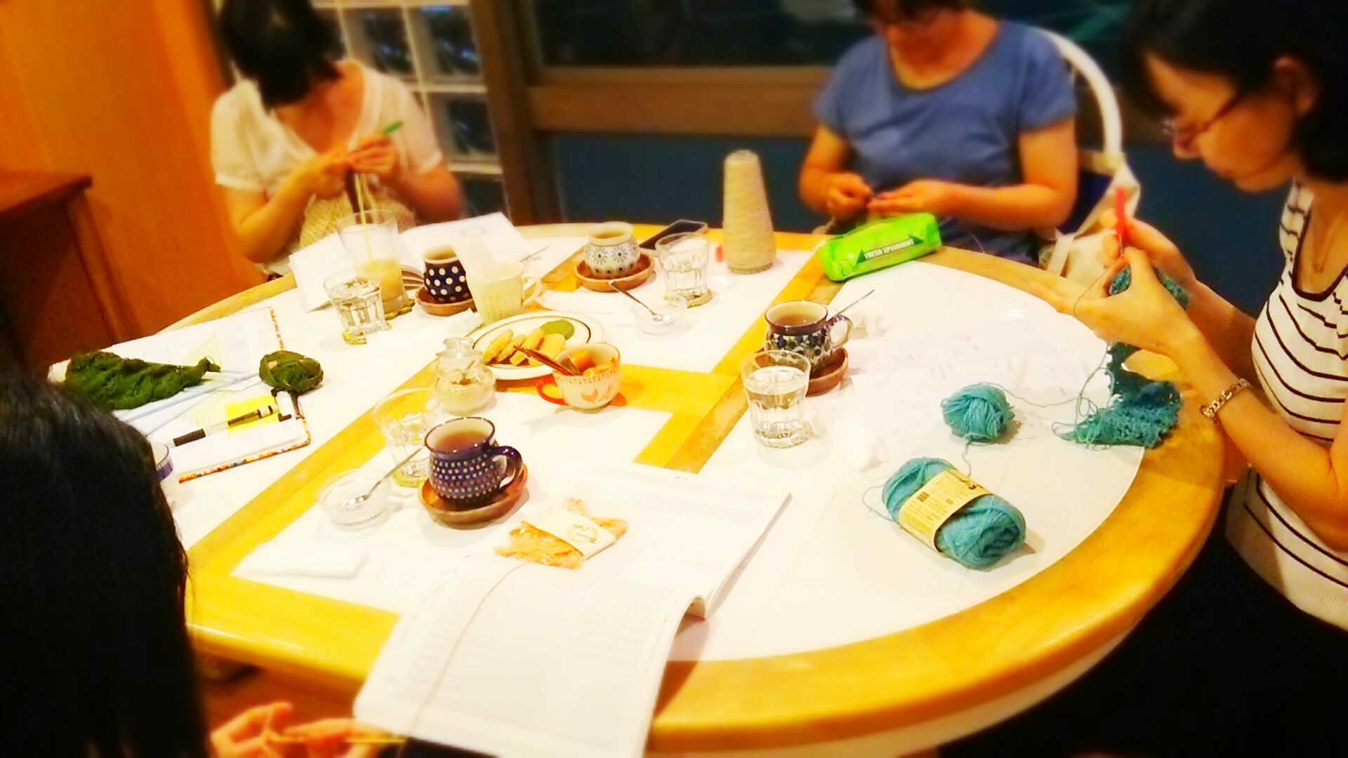 ひとつのテーブルを囲んで編み編みしています。大事な目をひーふーみーと数えていることもあるかもしれないので、ちょっぴりのご協力をお願いしますね。