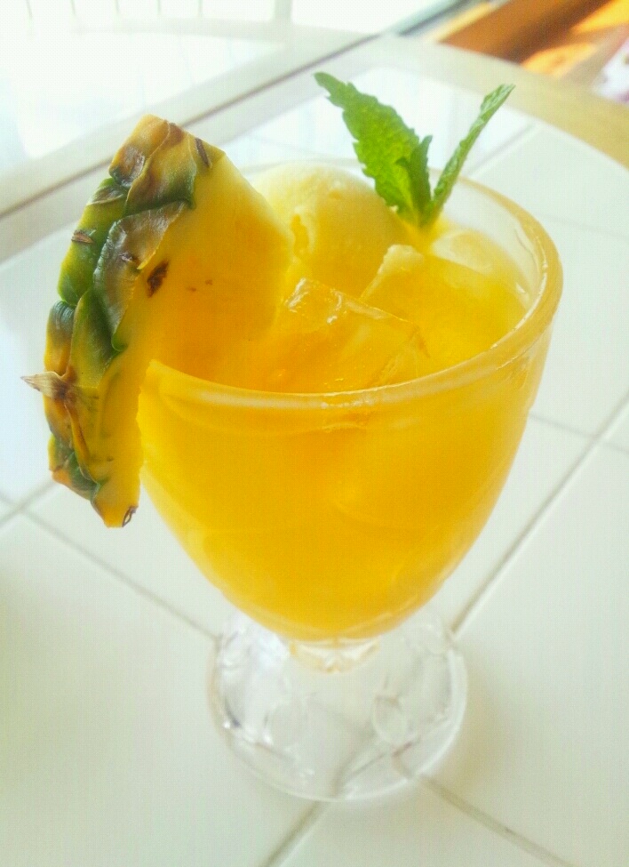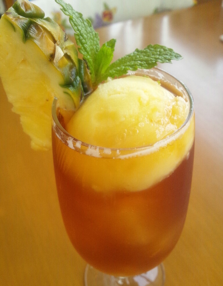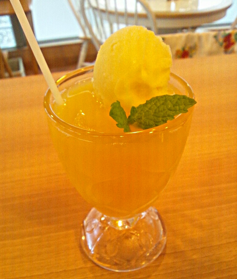 ノンシュガーのアールグレイアイスティーに、果肉とシャーベットが乗ってます。さっぱり甘さ控えめです。