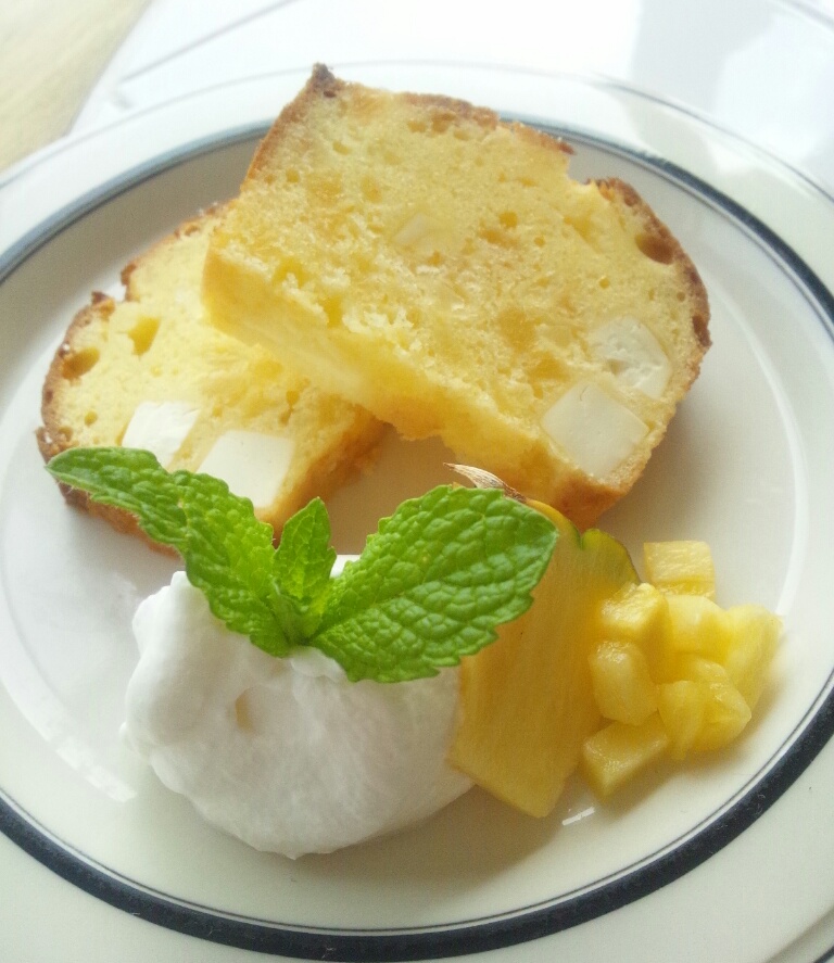 洋酒漬けのドライパインと、クリームチーズをたっぷり生地に練り込みました。