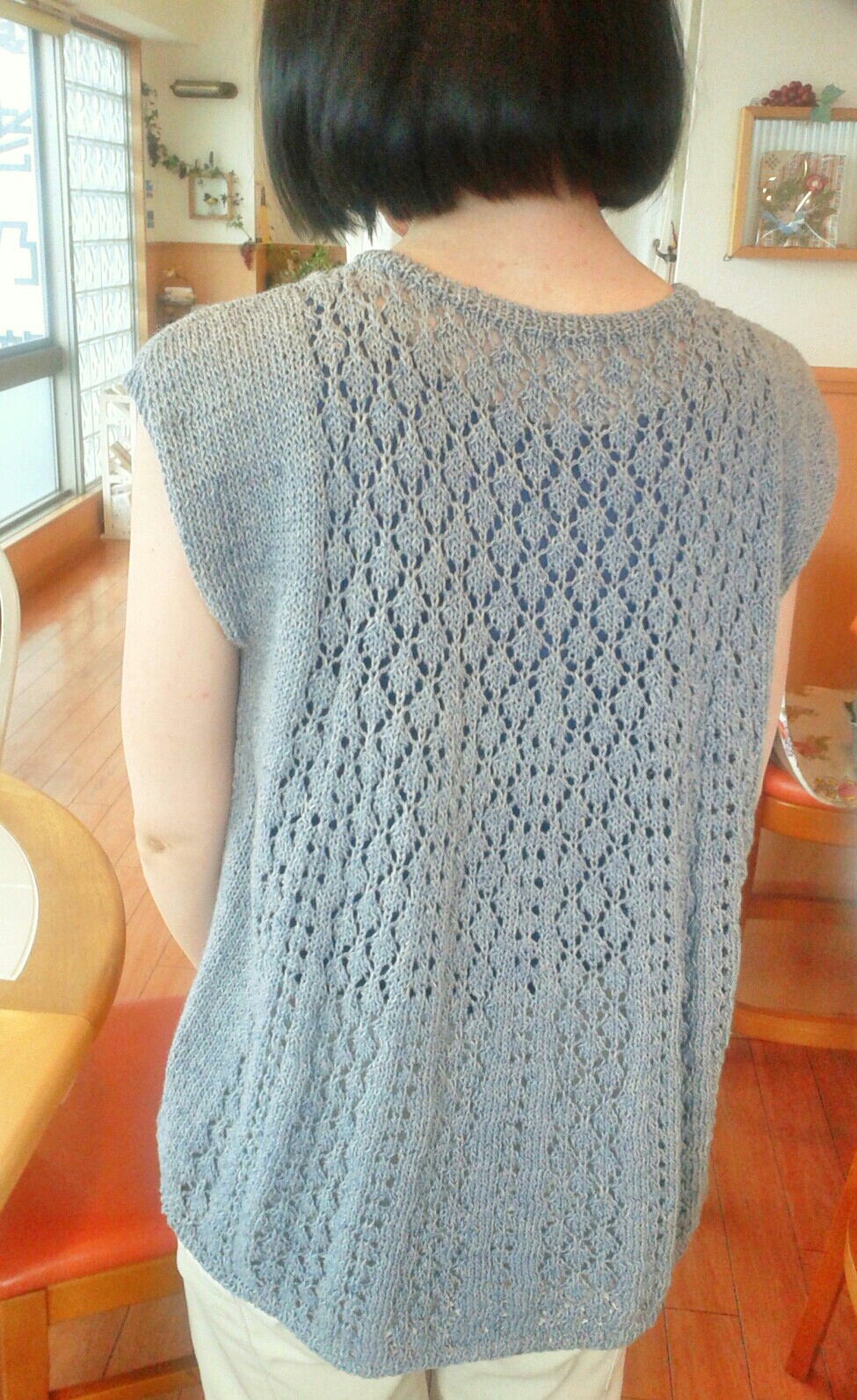 部員のOさんが3ヶ月前から編んでいたニットが完成したようで、肌寒いからか、サプライズなのか、シャツのなかにこっこり着込んでました。