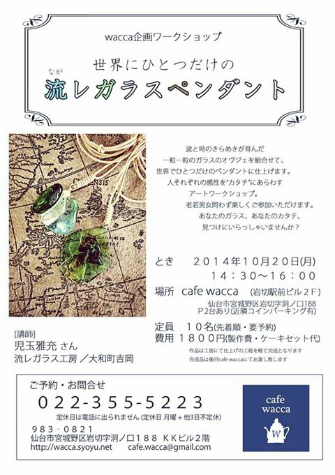 少し先ですが、10月20日(月)に講師をお招きしてcafe waccaでワークショップのイベントを開催します。 たくさんのガラスのなかからお気に入りの色やカタチを見つけて、組み合わせて、自分だけのペンダントにしてみませんか?