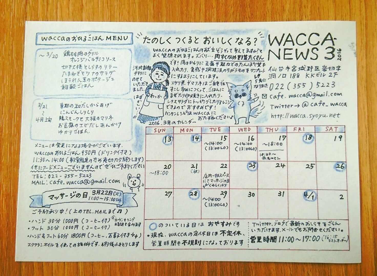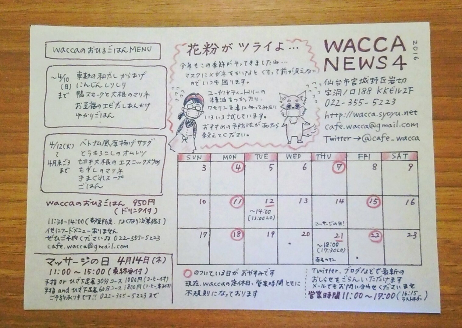 waccaのおひるごはんは数量限定となっております。他にフードメニューはありませんので、ご来店予定のお客様はぜひご予約ください。022-355-5223