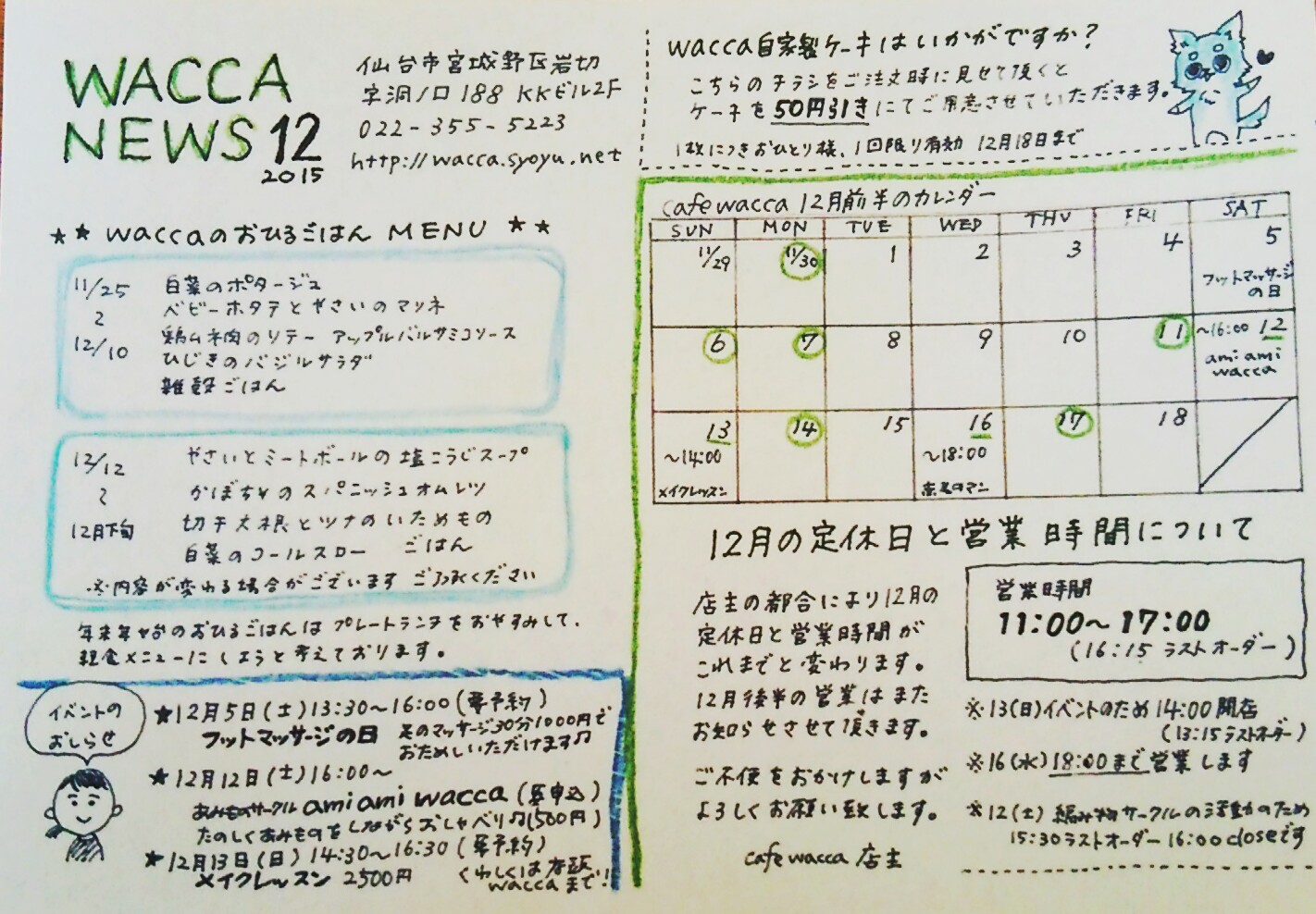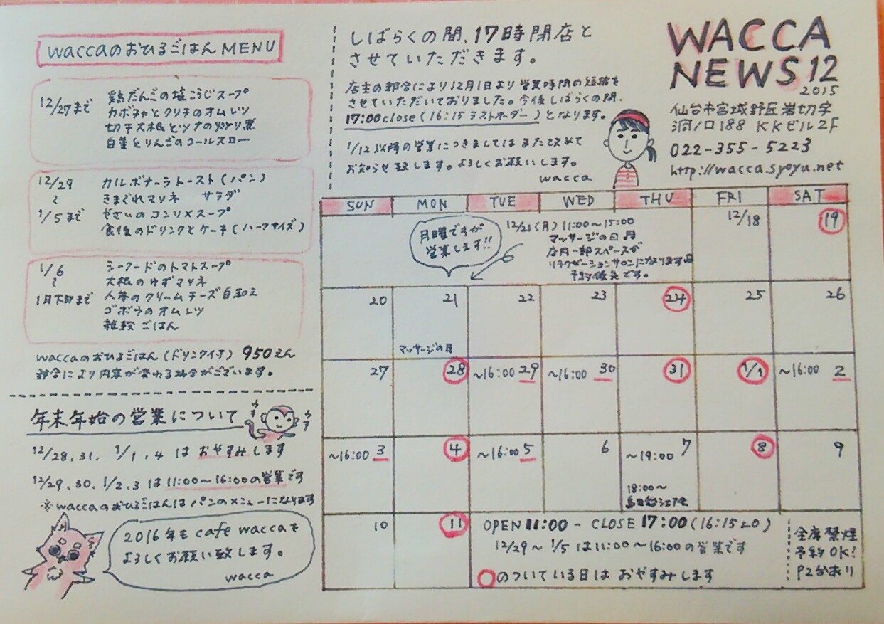 興味のある方、ご希望の方は022-355-5223もしくはcafe.wacca@gmail.comまでご連絡くださいませ。